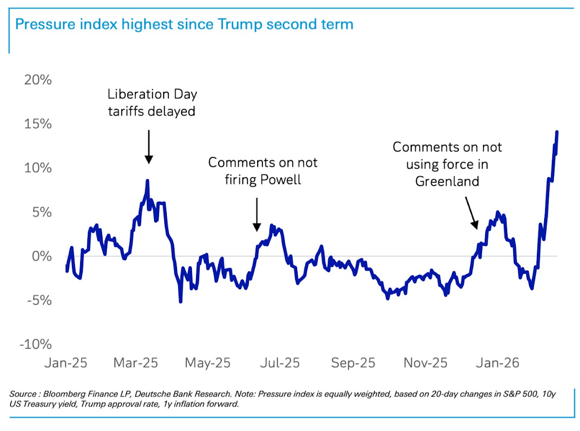 وبالنظر إلى مؤشر الضغط المركّب (Pressure Index) من دويتشه بنك، الذي يجمع عائد سندات الـ١٠ سنوات الأمريكية وأداء مؤشر S&P 500 وتوقعات التضخم وشعبية ترامب داخل الولايات المتحدة، والذي يستخدمه دويتشه بنك لقياس حجم الضغط على الإدارة الأمريكية، نرى أنه يُشير إلى أن الضغط السياسي على الإدارة للبحث عن حل بات هائلًا ومتصاعدًا.