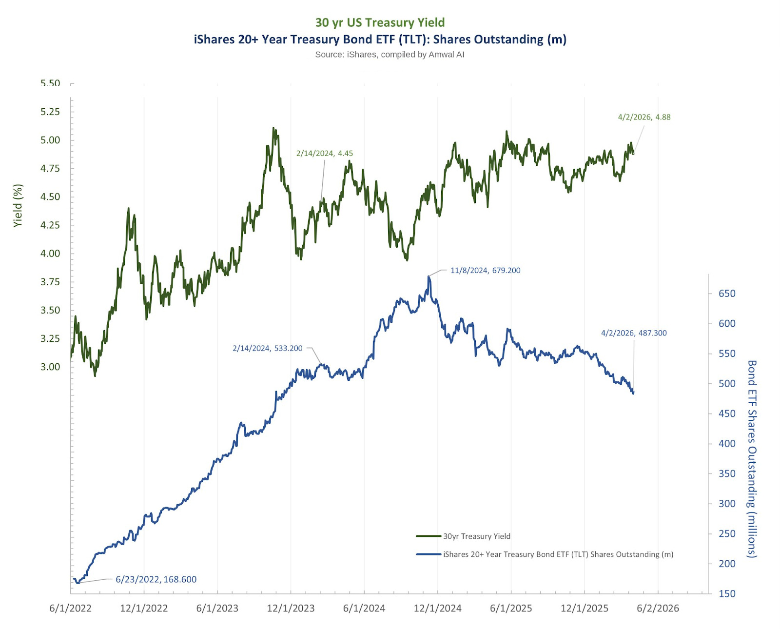 في المقابل، يسير عدد الأسهم المطروحة لصندوق iShares 20+ Year Treasury Bond ETF – TLT وهو أداة التعرّض للسندات طويلة الأجل، في اتجاه الهبوط منذ أن بلغ أعلى مستوى له في نوڤمبر ٢٠٢٤. ما يشير إلى أن المستثمرين في سوق السندات يرسمون خطًا فاصلًا عند أجل العشر سنوات، حيث يُنظر إلى الآجال الأبعد على أنها تحمل قدرًا مفرطًا من مخاطر التضخم وعدم اليقين يفوق المكاسب المحتملة.