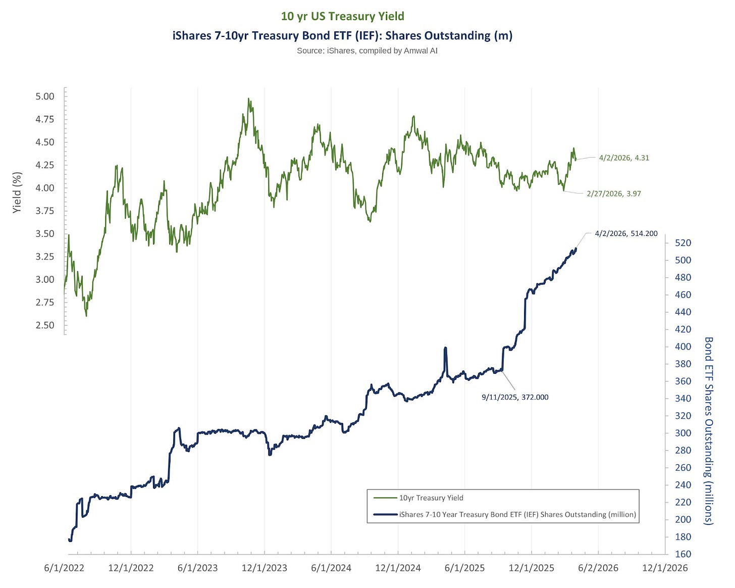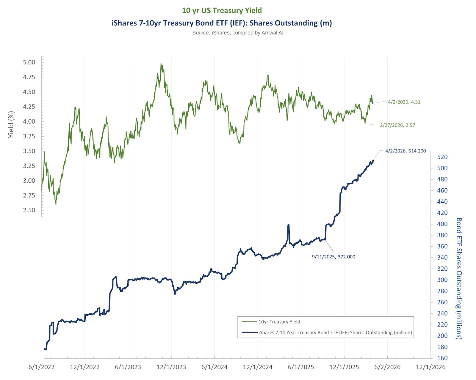 منذ اندلاع الحرب، ارتفع عائد سندات الخزانة لأجل ١٠ سنوات من ٣٫٩٧٪ إلى ٤٫٣١٪. ورغم هذا الارتفاع، فإن عدد الأسهم المطروحة لصندوق iShares 7-10 Year Treasury Bond ETF – IEF، وهو أبرز أدوات التعرّض لسندات الأجل المتوسط، يرتفع بشكل متواصل منذ بداية العام ما يشير إلى استمرار تدفق رؤوس الأموال. هذه التدفقات الضخمة نحو السندات متوسطة الأجل تحمل دافعين محتملين: أولًا، توقّع انخفاض عائد العشر سنوات مع تباطؤ الاقتصاد، وثانيًا، التنويع بعيدًا عن الأسهم نحو الملاذات الآمنة التقليدية استعدادًا لركود وشيك.